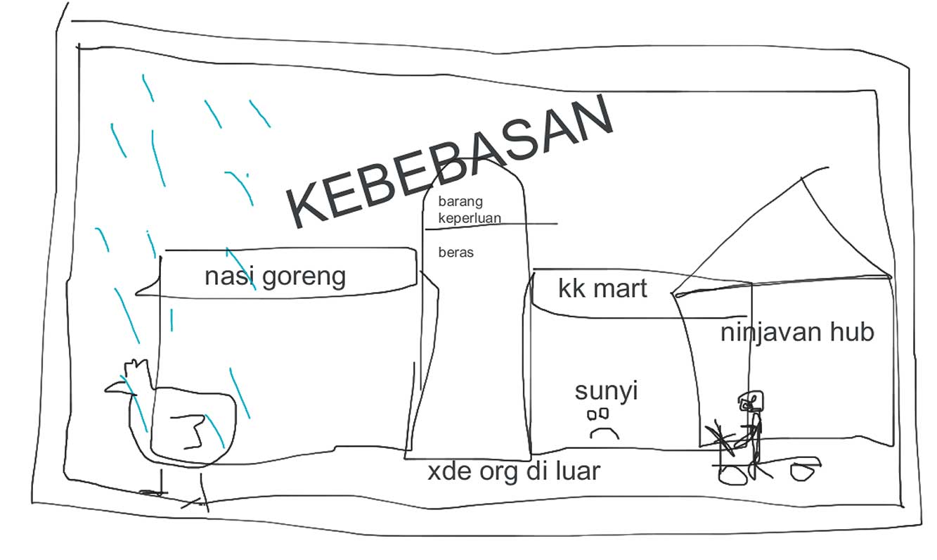 As shown in map [1], the world beyond the students’ apartments represented Kebebasan. Essential goods and delivery services dominated the drawings, reflecting life in lock down. KK mart, restaurants, and kedai runcit were the spaces they continued to keep in touch with.