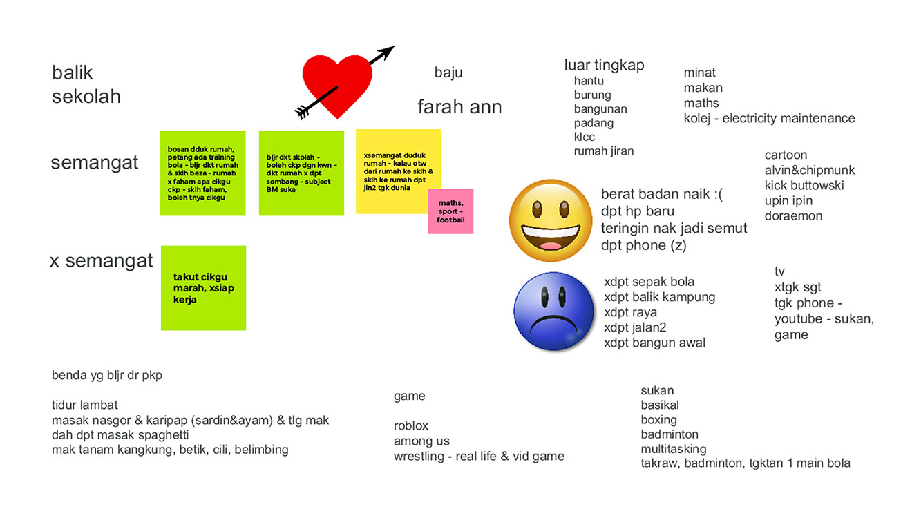 Inability to access physical public spaces drove an overarching sense of disconnection and stagnation. In map [3], many students hoped to return to school not only for education, but so they “boleh cakap dgn kawan” or they could see the world “on the way dari rumah ke sekolah.” They found some respite through gardening and cooking with their mothers (see bottom left).