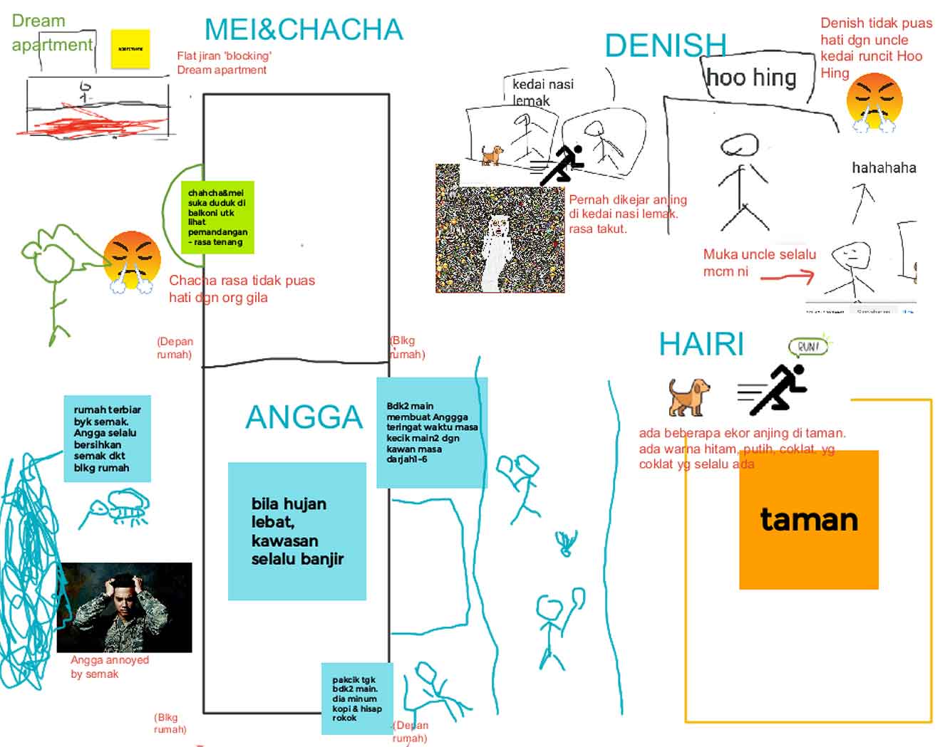In map [2], we see how students incorporated funny stories about being chased by dogs when attempting to access food stalls or the park (middle top and bottom right). In the bottom left, semak and mosquitos near their houses were described as annoying. One student described having to clear the undesirable weeds.